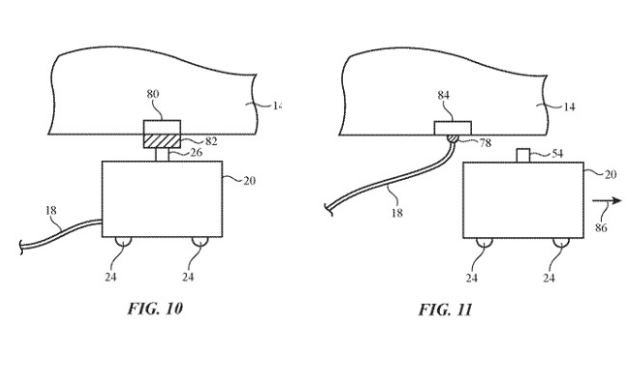 蘋果創(chuàng)建一個可以在地板上移動的設(shè)備,一旦觸發(fā)就可以移動。在移動到位后,該裝置然后通過基座安裝的接收器向車輛供電。另一個觸發(fā)器可用于斷開設(shè)備并將其縮回。