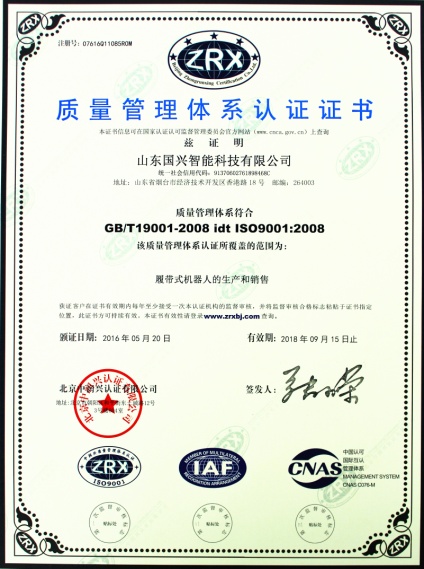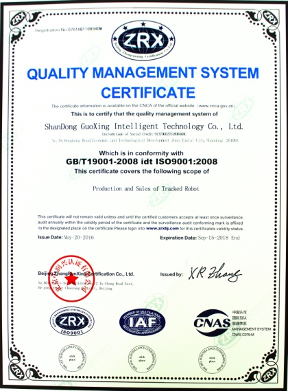 2016年5月國家正式頒發(fā)的質(zhì)量體系認證書,“國興智能”履帶式機器人底盤的生產(chǎn)和銷售全面上市,目前研發(fā)產(chǎn)品有:SAFARA系列、SSR系列、SATV系列等