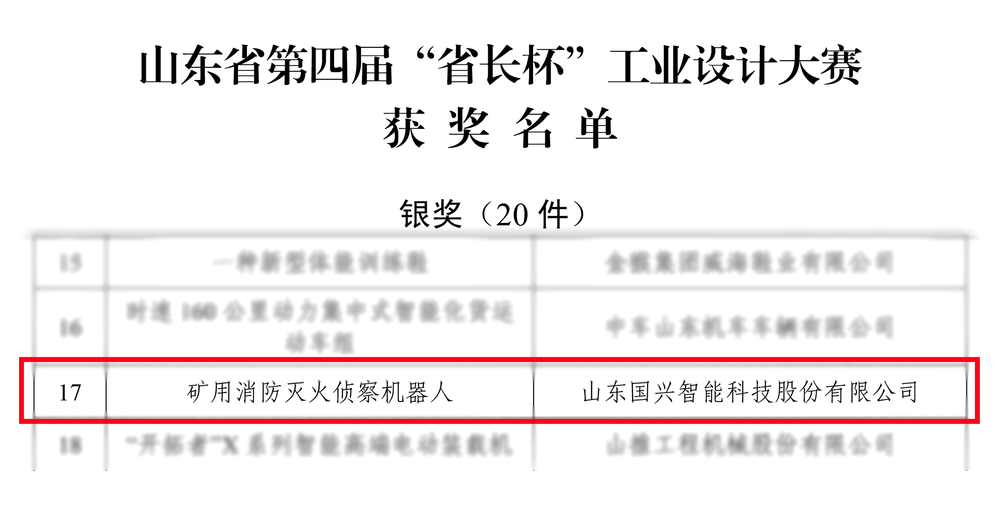 近日,山東省第四屆“省長杯”工業(yè)設計大賽獲獎名單公布。山東國興智能科技股份有限公司《礦用消防滅火偵察機器人》項目獲得銀獎。