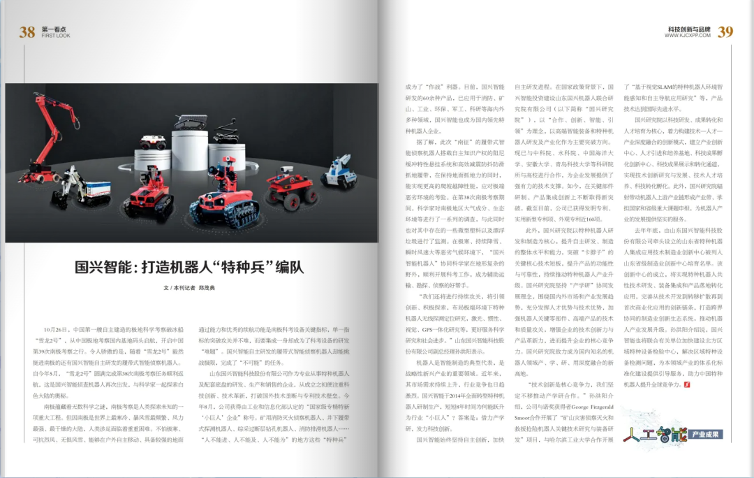 山東國(guó)興智能科技股份有限公司作為專(zhuān)業(yè)從事特種機(jī)器人及配套底盤(pán)的研發(fā)、生產(chǎn)和銷(xiāo)售的企業(yè),從成立之初便注重科技創(chuàng)新、技術(shù)革新,打破國(guó)外技術(shù)壟斷與專(zhuān)利技術(shù)壁壘。今年8月,公司獲得由工業(yè)和信息化部認(rèn)定的“國(guó)家級(jí)專(zhuān)精特新‘小巨人’企業(yè)”稱(chēng)號(hào)。礦用消防滅火偵察機(jī)器人、井下履帶式探測(cè)機(jī)器人、綜采過(guò)斷層鉆孔機(jī)器人、消防排澇機(jī)器人……“人不能進(jìn)、人不能及、人不能為”的地方這些“特種兵”成為了“作戰(zhàn)”利器。目前,國(guó)興智能研發(fā)的60余種產(chǎn)品,已應(yīng)用于消防、礦山、工業(yè)、環(huán)保、軍工、科研等海內(nèi)外多種領(lǐng)域,國(guó)興智能也成為國(guó)內(nèi)領(lǐng)先特種機(jī)器人企業(yè)。