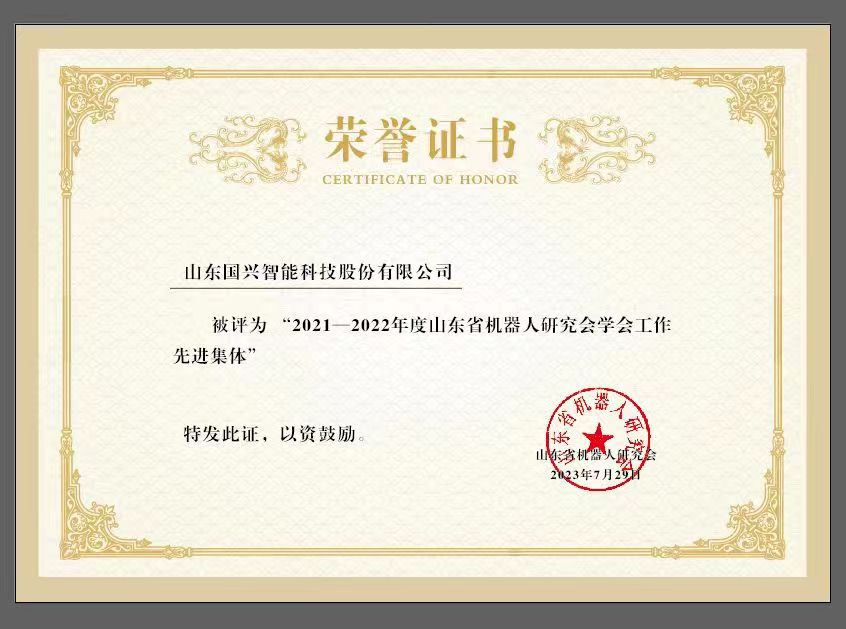 圖為:國興智能榮獲2021—2022年度山東省機(jī)器人研究會學(xué)會工作先進(jìn)集體證書