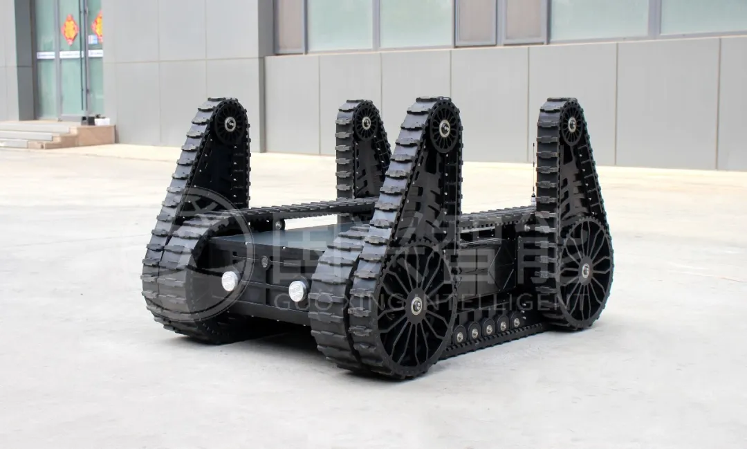 擺臂底盤底盤具有防護等級高,負載能力強,全地形機動性強等優(yōu)點,底盤結構剛度高,布局緊湊合理,適用于各種復雜環(huán)境。四擺臂可單獨控制,實現(xiàn)“攀爬式”行走方式,越障能力很強,可原地轉向,移動靈活、速度快且速度可調(diào),廣泛用于復雜環(huán)境下的機器人移動解決方案。