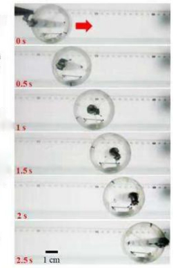 近期,中澳聯(lián)合研究團(tuán)隊(duì)設(shè)計(jì)了一種具有超疏水表面的極輕半封閉輪式結(jié)構(gòu),將液態(tài)金屬液滴限制在狹長的輪體內(nèi)部。再通過巧妙設(shè)計(jì)的隨動(dòng)微型電極支架,施加外部電場(chǎng)驅(qū)動(dòng)輪體內(nèi)液態(tài)金屬運(yùn)動(dòng),進(jìn)而持續(xù)改變輪式機(jī)器人的重心,驅(qū)動(dòng)其移動(dòng)。