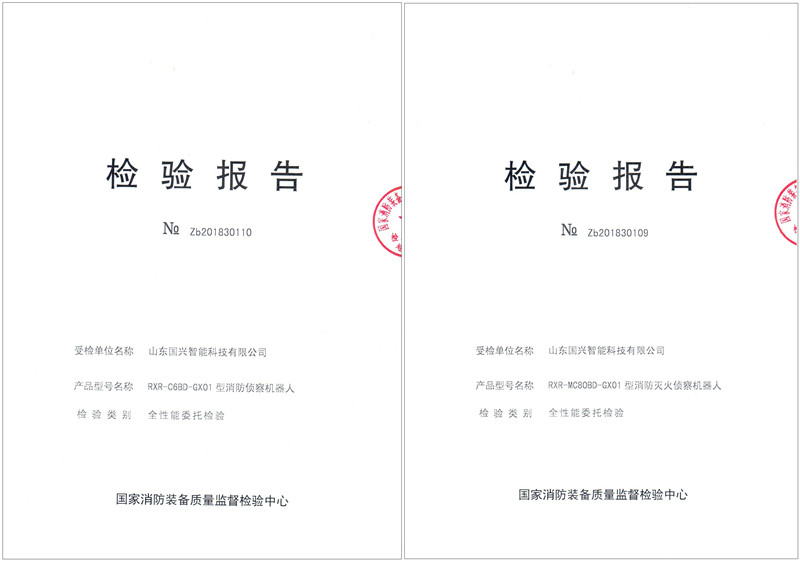 祝賀山東國興智能科技有限公司產(chǎn)品RXR-C6BD-GX01型消防偵察機(jī)器人和RXR-MC80BD-GX01型消防滅火偵察機(jī)器人獲得“國家消防裝備質(zhì)量監(jiān)督檢驗(yàn)中心”頒發(fā)的檢驗(yàn)報(bào)告證書。