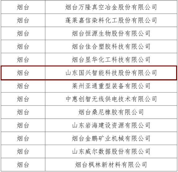 近日,山東省瞪羚企業(yè)(第三批)名單公布,煙臺開發(fā)區(qū)共計10家企業(yè)躋身其中,山東國興智能科技股份有限公司榜上有名。