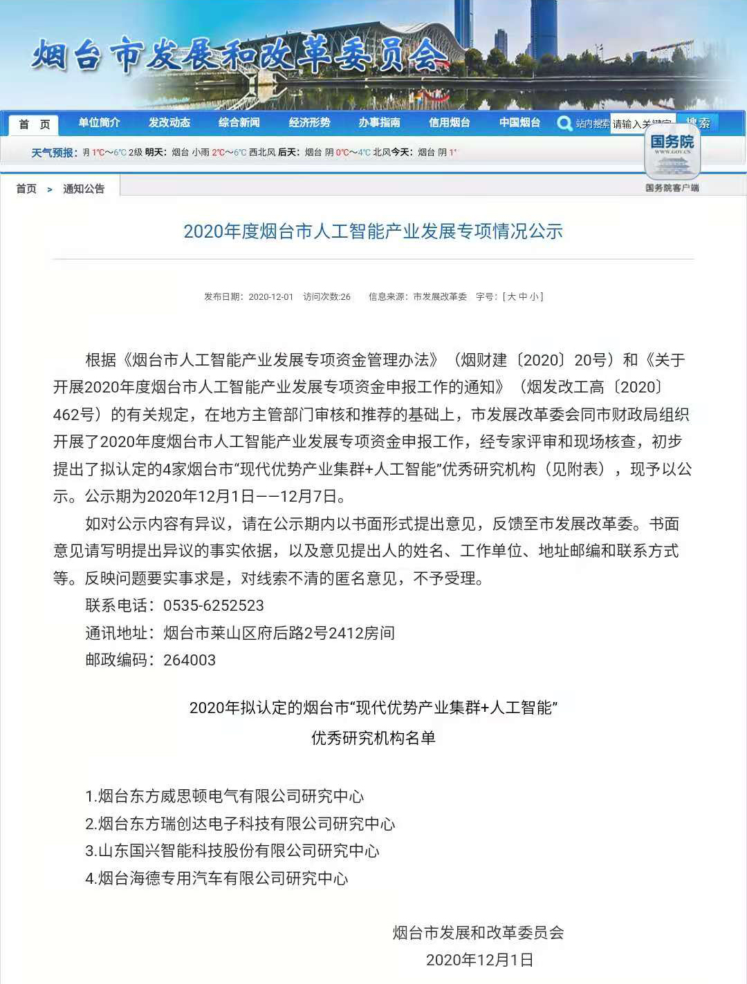 為加快推動現(xiàn)代優(yōu)勢產(chǎn)業(yè)集群+人工智能創(chuàng)新發(fā)展,煙臺市發(fā)展改革委員會同市財政局組織開展了2020年度煙臺市人工智能產(chǎn)業(yè)發(fā)展專項資金申報工作,經(jīng)過專家評審和現(xiàn)場核查,國興智能榮獲“現(xiàn)代優(yōu)勢產(chǎn)業(yè)集群+人工智能”優(yōu)秀研究機構(gòu)榮譽稱號。