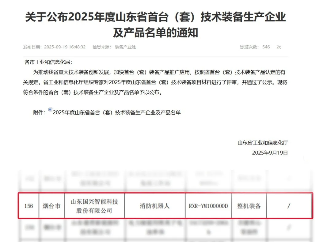 為推動山東省高端裝備產(chǎn)業(yè)高質(zhì)量發(fā)展,加快培育新質(zhì)生產(chǎn)力,充分發(fā)揮首臺(套)政策的支撐作用——“2025年度山東省首臺(套)技術(shù)裝備生產(chǎn)企業(yè)及產(chǎn)品名單”正式公布。山東國興智能科技股份有限公司消防機(jī)器人RXR-YM100000D成功登榜。